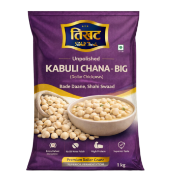 Tikhat Foods Kabuli Chana Big features premium, large-sized chickpeas that are 100% unpolished to retain their natural protein and fiber. These chickpeas are sourced for uniform quality and exceptional taste, ensuring a soft and creamy texture when cooked. A healthy, chemical-free staple, they are perfect for creating delicious Chole, salads, and other nutritious global cuisines.