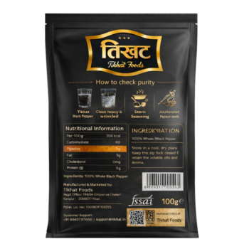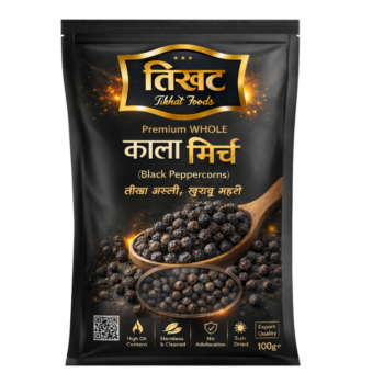 Tikhat Foods Kali Mirch offers premium, whole black peppercorns known for their bold flavor and intense aroma. Naturally sourced and hygienically packed, these peppercorns are 100% pure and rich in essential oils. Perfect for seasoning, tempering, or grinding fresh, it adds a sharp spicy punch and healthy digestive benefits to all your favorite Indian and global recipes.