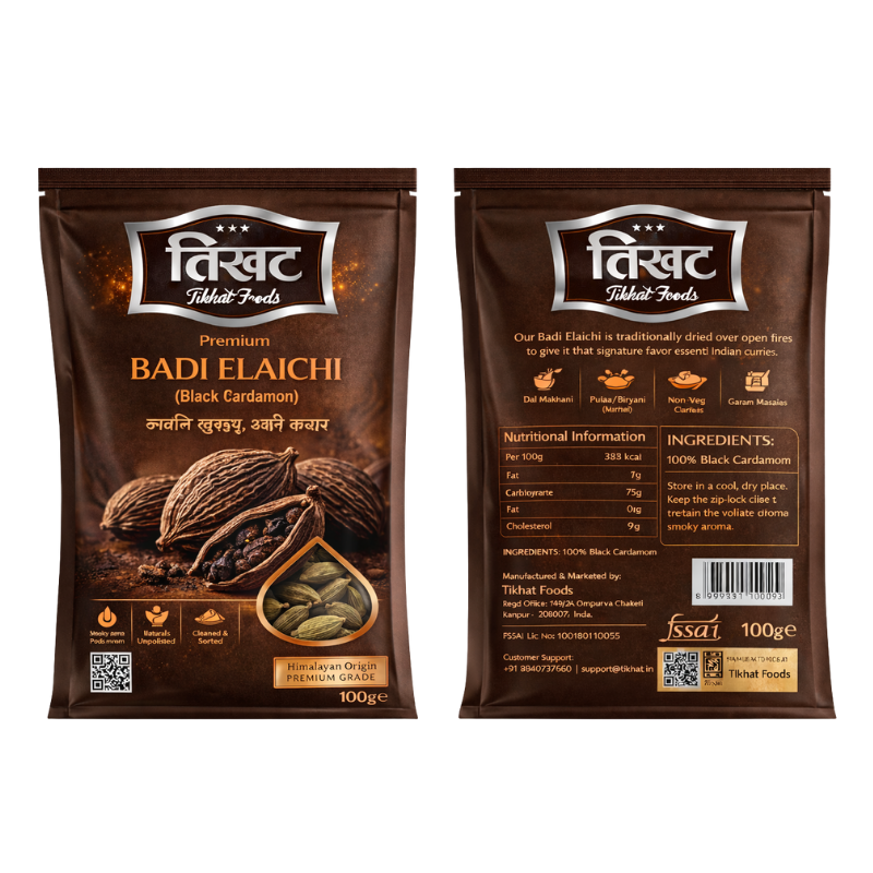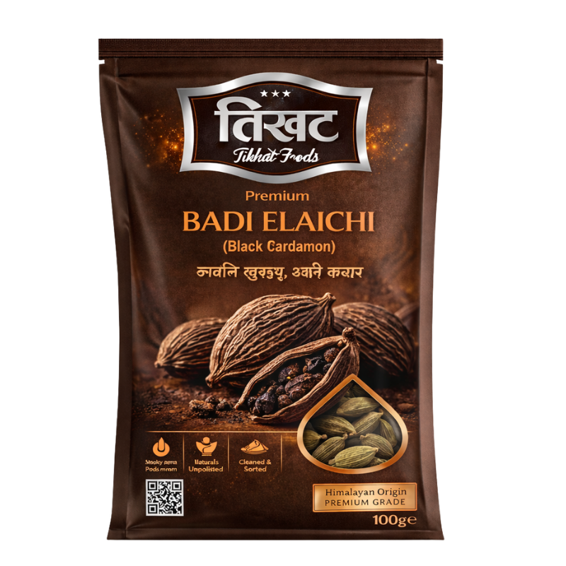 Each pod is packed with flavor-rich seeds that release an intense warmth when added to slow-cooked dishes. Tikhat Foods ensures that our spices are 100% natural and unadulterated, free from artificial colors or flavor enhancers. It is an indispensable ingredient for tempering dals, preparing hearty meat curries, and creating aromatic spice blends like Garam Masala. Packaged under strict hygienic conditions, our Badi Elaichi retains its freshness and medicinal properties, including aiding digestion and improving respiratory health.