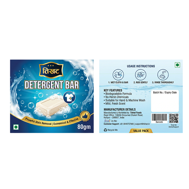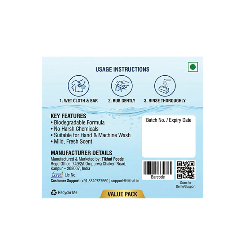 Tikhat Foods Detergent Bar is a powerful laundry bar designed to cut through stubborn stains and grime on all types of fabrics. Formulated with strong cleaning agents, it easily removes tough marks from mud, oil, food, tea, and sweat — even in hard water conditions. Ideal for daily laundry and handwashing, the bar lathers quickly and rinses off cleanly without leaving residue, helping your clothes stay fresh, bright, and soft. Compact and long-lasting, this detergent bar is perfect for regular household use and delivers reliable performance wash after wash.