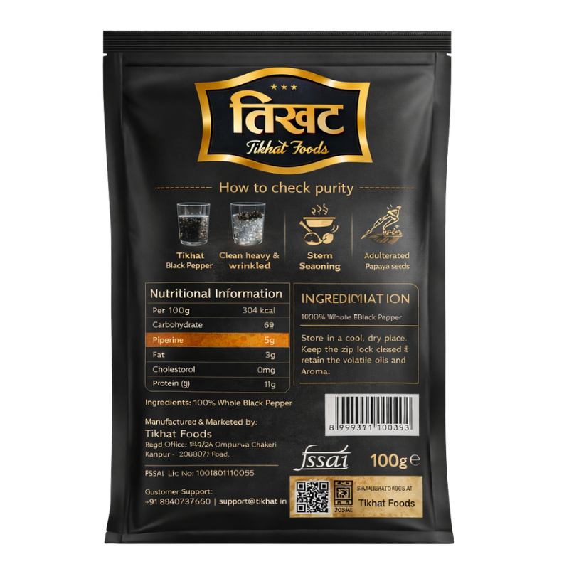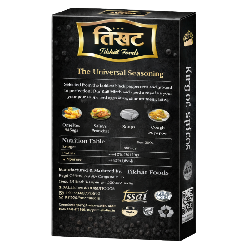 At Tikhat Foods, we maintain the highest standards of purity. Our Kali Mirch is 100% natural and unadulterated, free from any artificial colors, preservatives, or added mineral oils. The peppercorns are hygienically cleaned and packed to retain their natural essential oils and woody aroma. Whether you use them whole in biryanis, crushed over salads, or finely ground for soups, Tikhat Foods ensures a gourmet experience that adds a healthy, spicy kick to your daily culinary creations.