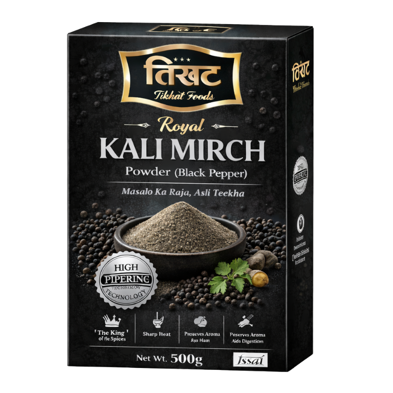Tikhat Foods Kali Mirch offers premium, whole black peppercorns known for their bold flavor and intense aroma. Naturally sourced and hygienically packed, these peppercorns are 100% pure and rich in essential oils. Perfect for seasoning, tempering, or grinding fresh, it adds a sharp spicy punch and healthy digestive benefits to all your favorite Indian and global recipes.