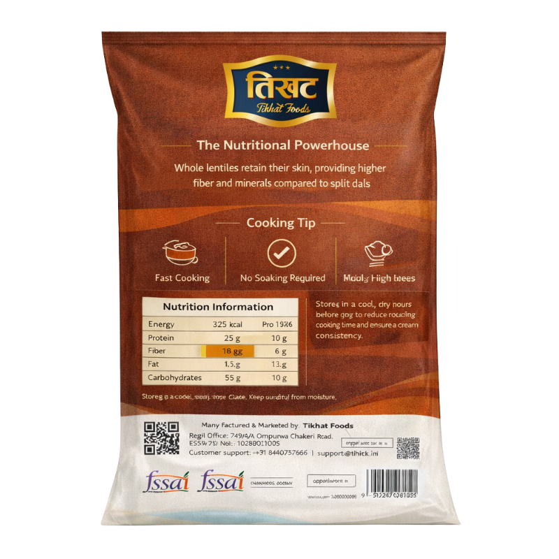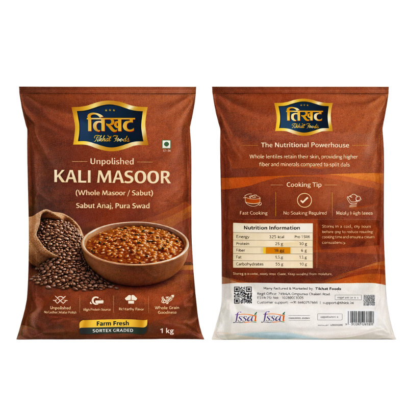 Experience the authentic taste and wholesome goodness of Tikhat Foods Masoor Dal-Kali. Our whole black lentils are completely unpolished, ensuring that the natural fiber, protein, and nutrients remain intact for a healthier meal. Sourced from the finest farms and subjected to rigorous quality checks, every pack delivers grains of uniform size and premium quality.